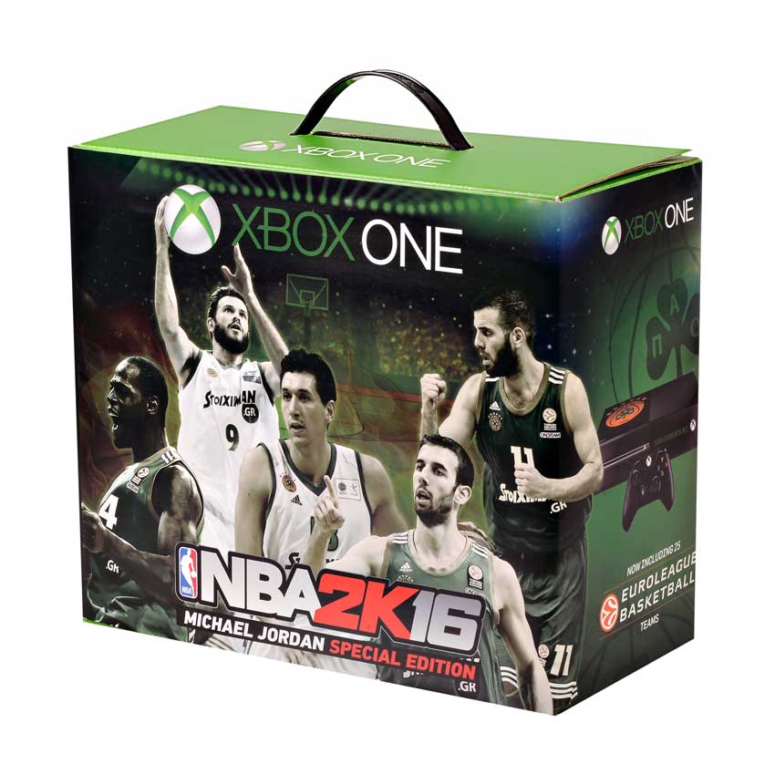 Το πακέτο περιλαμβάνει κονσόλα Xbox One με το λογότυπο του Παναθηναϊκού με 500GB σκληρό δίσκο και το παιχνίδι NBA 2K16 special edition. Μέσα στο παιχνίδι θα βρείτε μια αφίσα Michael Jordan NBA 2K16, διακοσμητικό τοίχου Michael Jordan, ψηφιακά αθλητικά παπούτσια Jordan για τον παίκτη σας (MyPLAYER), ψηφιακή μπλούζα (T-Shirt) Jordan για τον παίκτη σας (MyPLAYER), ψηφιακή μπλούζα (Jersey) Jordan για τον παίκτη σας (MyPLAYER). Επίσης στην συσκευασία θα βρείτε 30.000 σε ψηφιακά χρήματα παιχνιδιού (Virtual Currency), MyTEAM VIP+ που περιλαμβάνει 3 Emerald Packs, μια νέα κάρτα Special Edition Exclusive Moments, καθώς και ένα ασύρματο χειριστήριο Xbox One. Τέλος θα βρείτε ένα Καλώδιο HDMI, τροφοδοτικό ρεύματος με καλώδιο και 14 ημέρες δοκιμαστική συνδρομή στο Xbox Live Gold.
