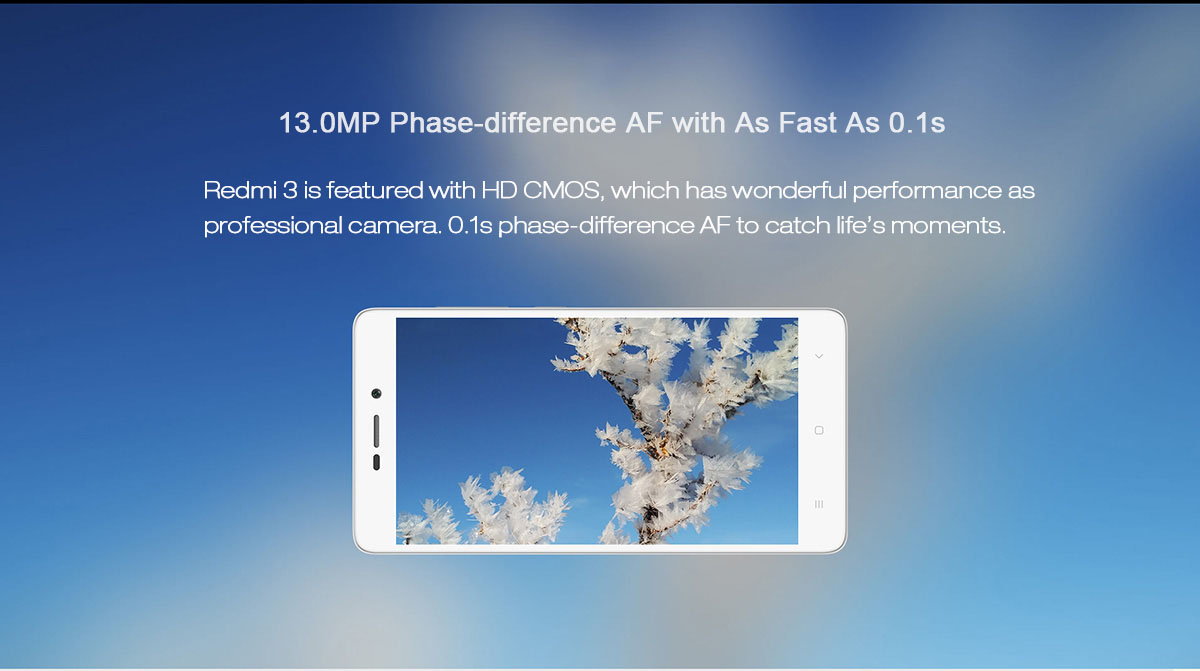 Ένα από τα βασικά χαρακτηριστικά του Xiaomi Redmi 3 είναι η εξαιρετική 13.0 Megapixel κάμερα, η οποία μπορεί να εστιάσει στον στόχο σας, σε μόλις 0.1 δευτερόλεπτο. Το διάφραγμα είναι στα 2.0 για εξαιρετικές φωτογραφίες ακόμα και σε χαμηλό φωτισμό. Η μπροστά κάμερα είναι 5.0 Megapixel, καταπληκτική για selfies. Λειτουργίες όπως Face detection, HDR και Panorama shot είναι διαθέσιμες για όλους τους επίδοξους φωτογράφους που θα αποκτήσουν την συσκευή.