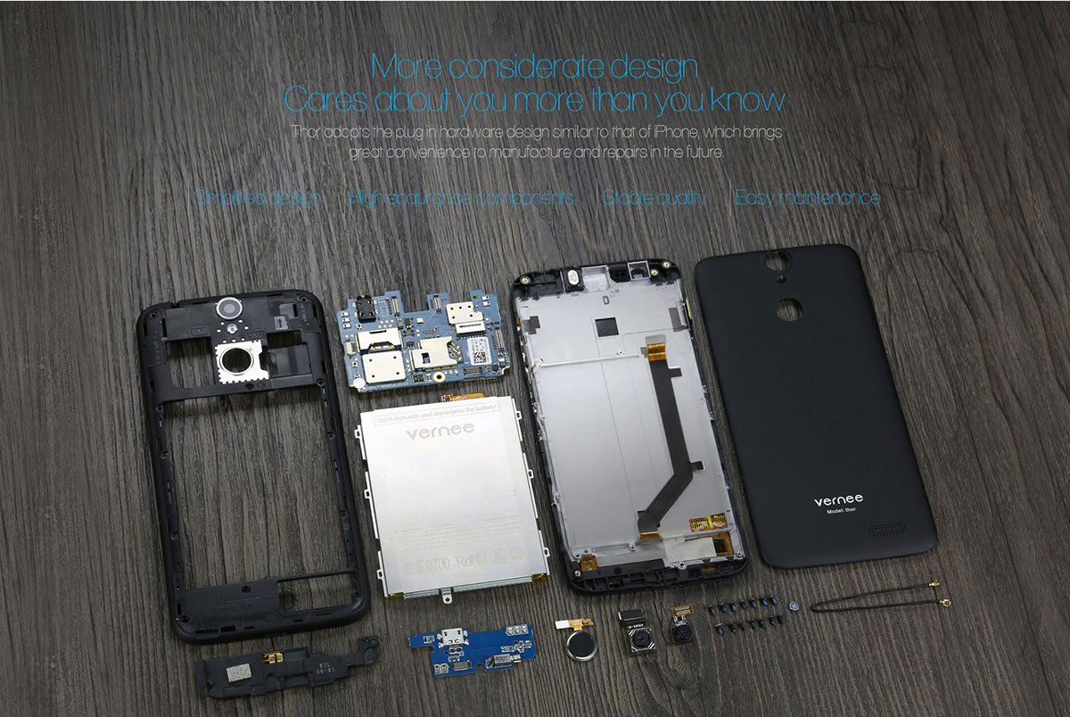 Ολόκληρο το μπροστινό μέρος είναι οθόνη, πράγμα που κάνει το smartphone όμορφο αισθητικά. Βέβαια από μία οθόνη πέραν του αισθητικού, χρειάζεται και η αντοχή, έτσι λοιπόν το Corning Glass 3 προστατεύει την οθόνη σας από κάθε πέσιμο. Μεταλλικό frane από κράμα τιτανίου κρατάει την συσκευή «δεμένη» και της δίνει μια αίσθηση πολυτέλειας. Το backcover του Thor, είναι μεν πλαστικό, αλλά το είδος του πλαστικού κάνει την διαφορά. Το υλικό που έχει διαλέξει η Vernee, είναι ένα είδος λάστιχου, το οποίο όπως δηλώνει η εταιρία, έχει ταυτόχρονα τέλεια αίσθηση στην αφή και δεν θα έχετε τον φόβο να μην σας πέσει από τα χέρια καθώς είναι αντιολισθητικό.