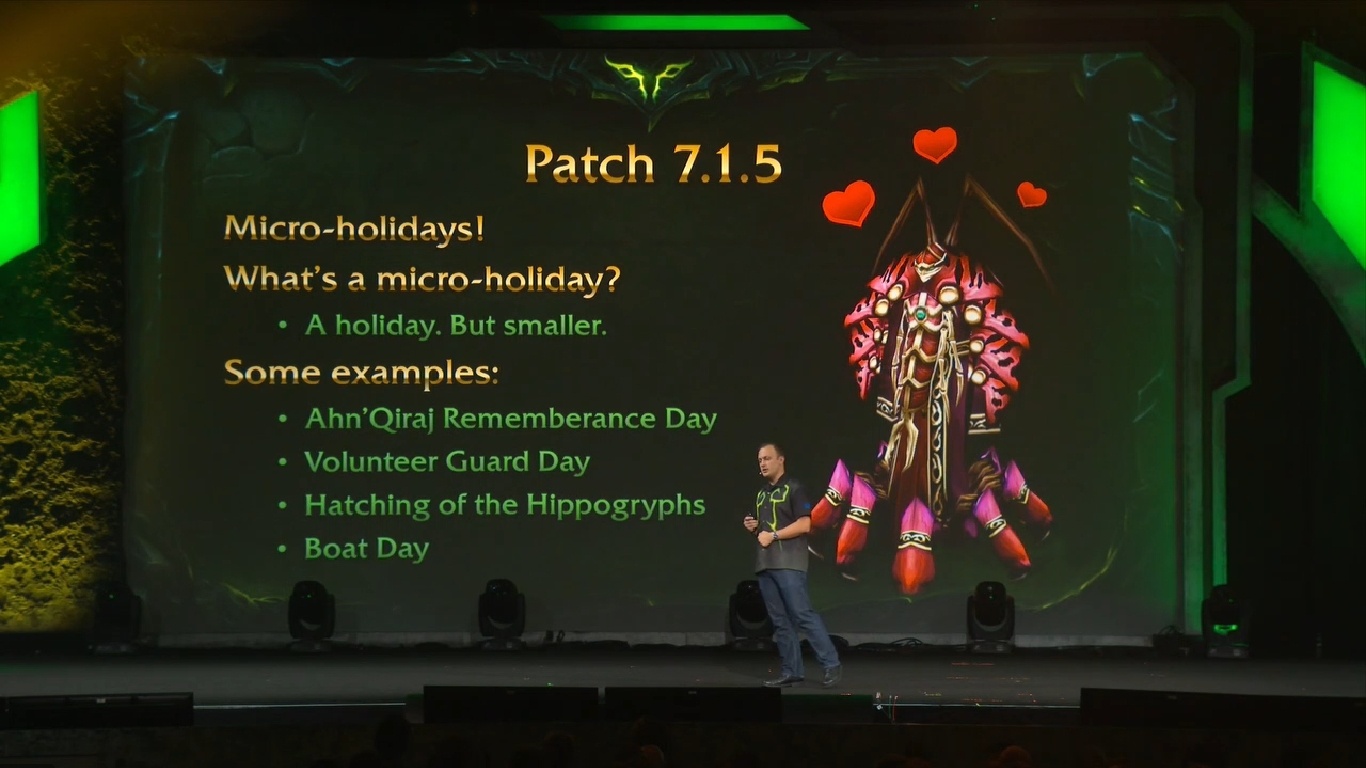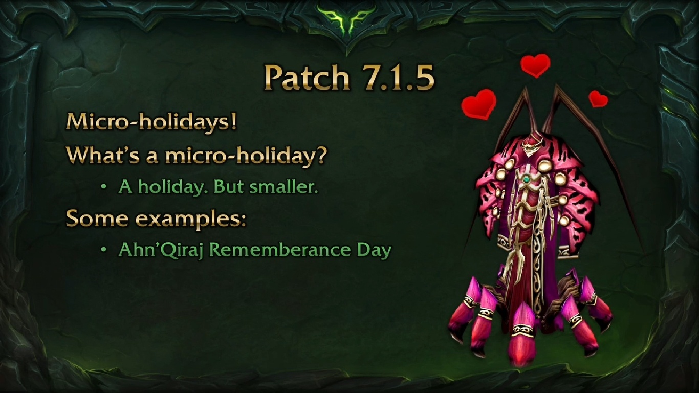 Μιλώντας πιο μακροπρόθεσμη, στο Patch 7.1.5 η Blizzard προσθέτει αυτό που θα ονομαστεί «micro – holidays». Σε περίπτωση που τα holiday events στο παιχνίδι θα διαρκούν για μια εβδομάδα ή δύο και προσφέρουν πολλές διαφορετικές ανταμοιβές, τα micro – holidays θα διαρκούν μόνο για μια ημέρα ή δύο και θα είναι εκεί μόνο για να αποσπάσουν ευχάριστα τους παίκτες από ό,τι κάνουν και να μην παρέχουν μόνο ανταμοιβές ή επιτεύγματα. Ένα παράδειγμα είναι η Ημέρα Μνήμης Ahn’Qiraj, η οποία θα λάβει χώρα στις 22 Ιανουαρίου, την ημέρα που οι πύλες του Ahn’Qiraj άνοιξαν για πρώτη φορά από τους παίκτες τότε στο 2006. Ένα άλλο είναι η Ημέρα Εθελοντισμού Φρουράς, όπου οι παίκτες θα μπορούν να αναλάβουν το ρόλο του φρουρού της πόλης και να κάνουν περιπολία. Επίσης εκκόλαψη των Hippogryphs – αν είστε στο Feralas αυτή την ημέρα – μπορείτε να ζήσετε την μία και μοναδική ημέρα το χρόνο που γεννιούνται τα Hippogryphs !