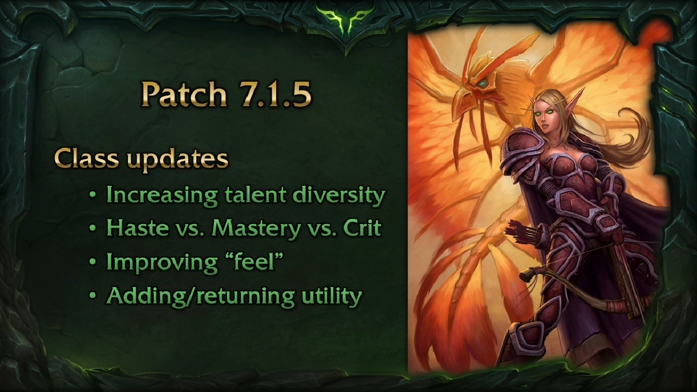 Τέλος, στο 7.1.5 θα δείτε την Blizzard να οργανώνει μια καινούρια ισορροπία των classes. Ο developer θα επεξεργαστεί κάποια talents που οι παίκτες δεν χρησιμοποιούν, θα ανακατέψει την επίδραση των δευτερευόντων στατιστικών όπως haste και crit, και μέσω του feedback από τους παίκτες θα βελτιώσει την «αίσθηση» των class ability rotations. Επίσης οι hunters θα έχουν και πάλι traps και οι rogues το Shroud of Concealment και θα έχουμε τέτοιες «επιστροφές» και σε άλλα classes.