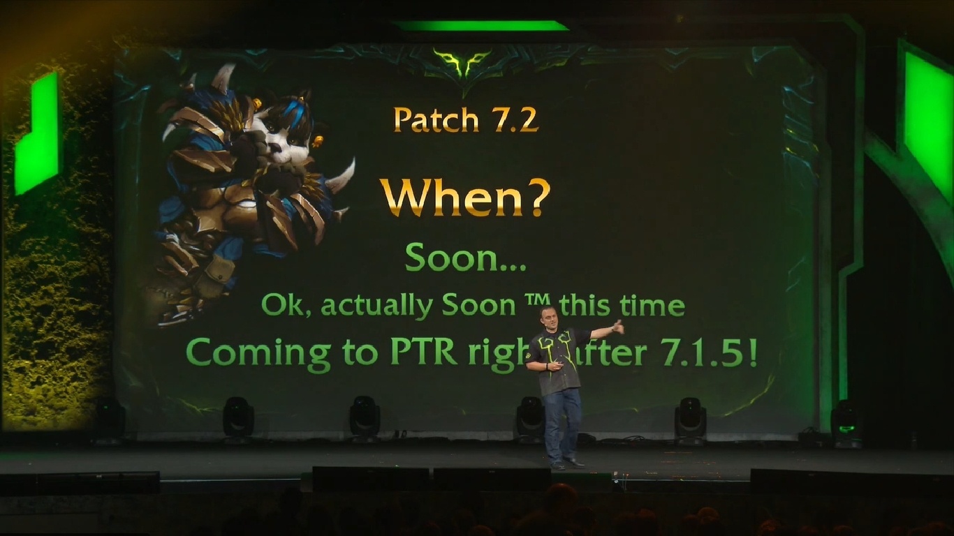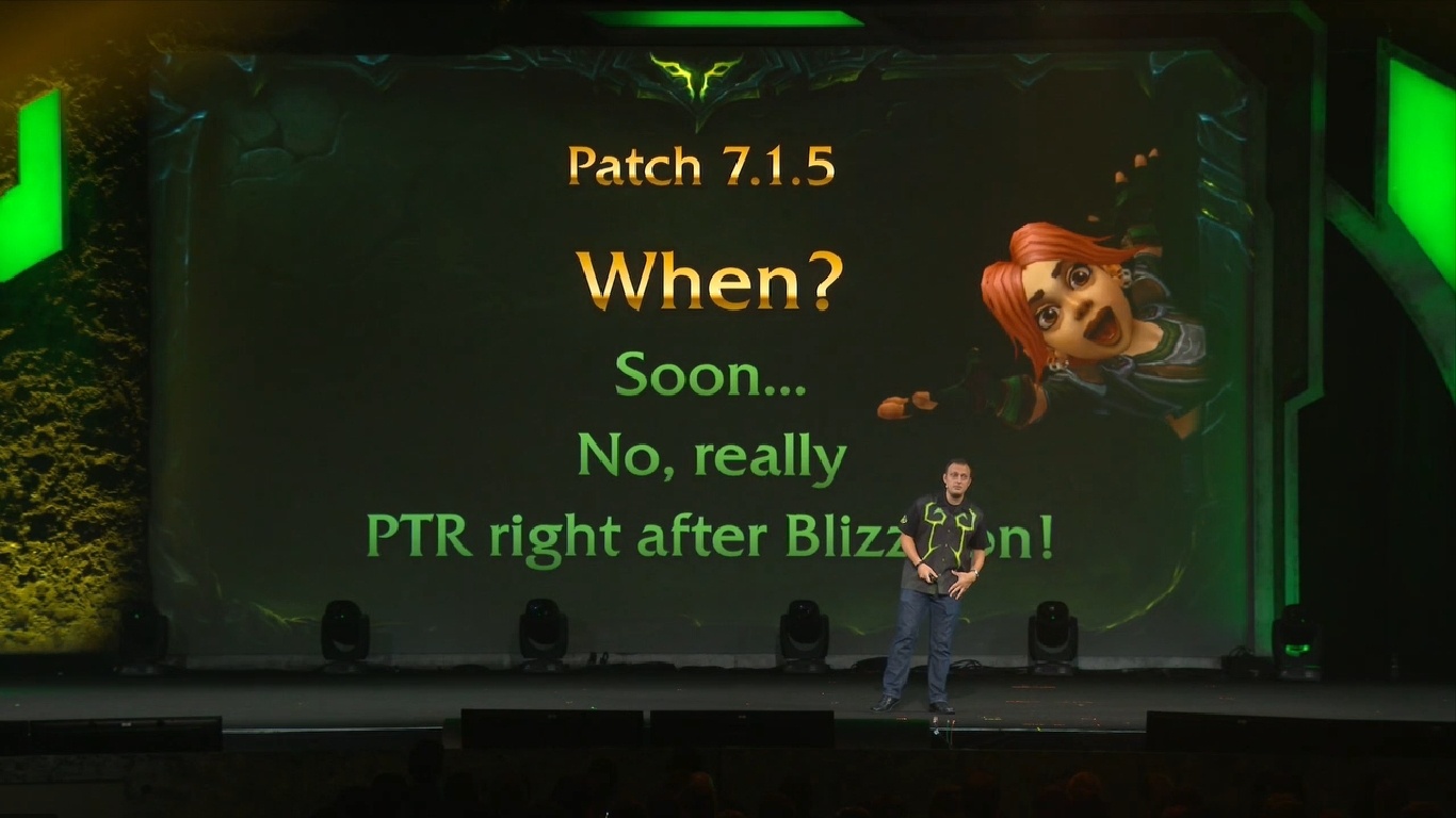 Η Blizzard ανακοίνωσε ότι το patch 7.1.5 θα είναι διαθέσιμο στο public test realm αμέσως μετά την BlizzCon, με την εμφάνιση στους live servers όχι πολύ μετά. Μόλις ξεκινήσει το 7.1.5, το Patch 7.2 θα ξεκινήσει στο PTR. Η Blizzard εξηγεί ότι αυτός ο επιθετικός ρυθμός για το νέο περιεχόμενο θα συνεχιστεί και ότι οι παίκτες θα πρέπει να περιμένουν test realm περιεχόμενο κάθε φορά που κάτι κινείται προς τους live servers. Ο developer είπε, ότι το patch 7.2.5 είναι στα σκαριά, και πέρα από αυτό άφησε να εννοηθεί και η συνέχεια.