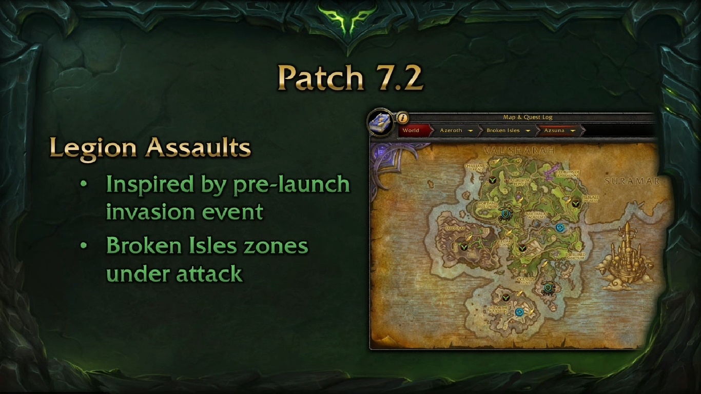 Στην BlizzCon 2016, ο developer Ion Hazzikostas αποκάλυψε τα δύο επόμενα patches με νέο περιεχόμενο: Patch 7.1.5 Patch 7.2