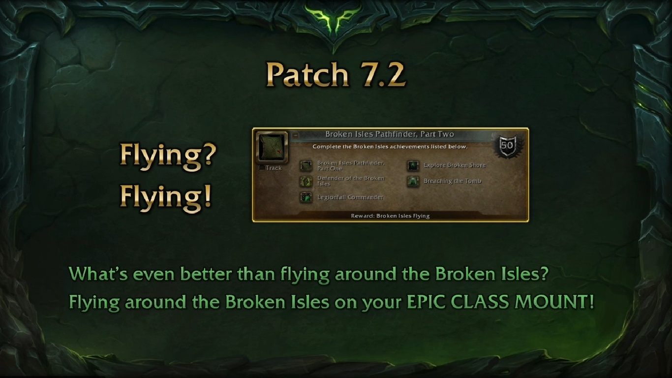 Οι παίκτες θα είναι σε θέση να επιτύχουν ένα νέο σύνολο achievements στο Patch 7.2 για να ξεκλειδώσουν το flying στα Broken Isles, το οποίο δεν έχει επιτραπεί ακόμη από την έναρξη του Legion . Εκτός από την επιστροφή του flying, οι παίκτες θα είναι σε θέση να κερδίσουν epic mounts που θα είναι μοναδικά για κάθε class. Αυτές κυμαίνονται από μια τίγρη για τους monks σε skeletal dragon για τους death knights, σε ένα τεράστιο wind elemental για τους σαμάνους, και όλα θα είναι και ικανά για πτήση.