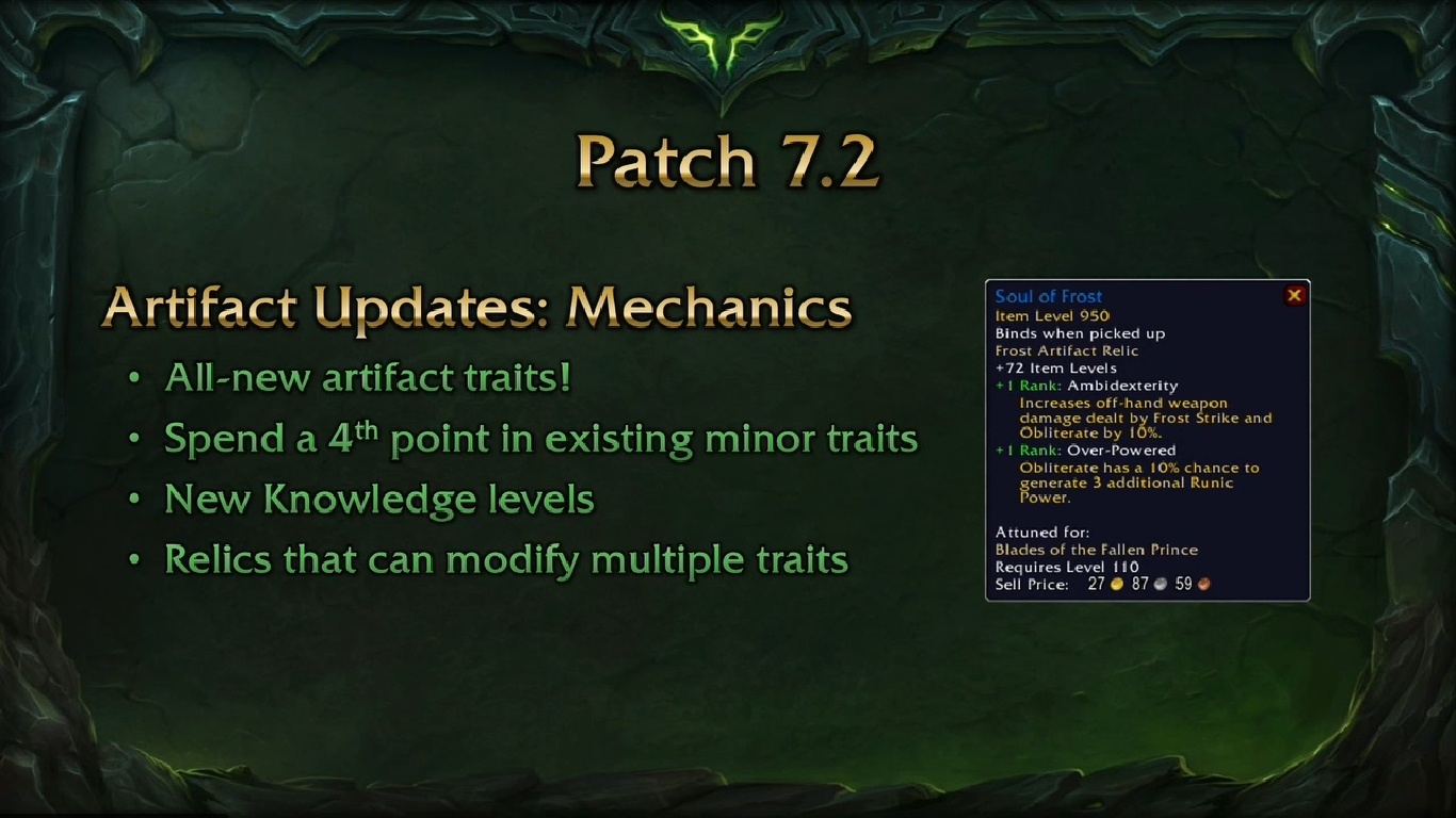 Τέλος, στο Patch 7.2 θα δείτε κάποιες προσθήκες στο artifact system. Νέα χαρακτηριστικά θα προστεθούν σε κάθε όπλο artifact, καθώς η δυνατότητα να αγοράσετε επιπλέον πόντους σε υπάρχοντα χαρακτηριστικά. Οι παίκτες θα πρέπει να κάνουν νέες αποστολές για να ξεκλειδώσουν αυτές τις νέες επιλογές πάνω στο trait . Θα υπάρξει και μια έκτη εμφάνιση για να ξεκλειδώσετε για κάθε όπλο artifact, η οποία θα είναι διαθέσιμη μέσω των solo play challenges.
